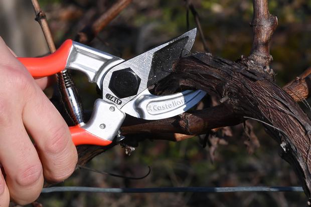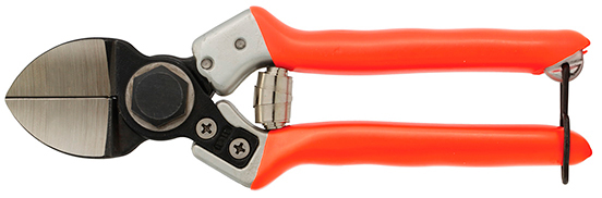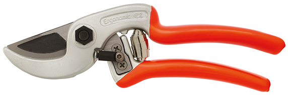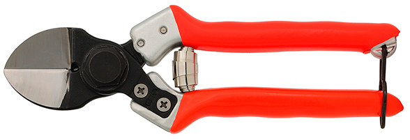 Sécateur professionnel avec butée courbe, ce qui permet de maintenir la branche immobile pendant la phase de coupe en évitant le rebond au poignet.