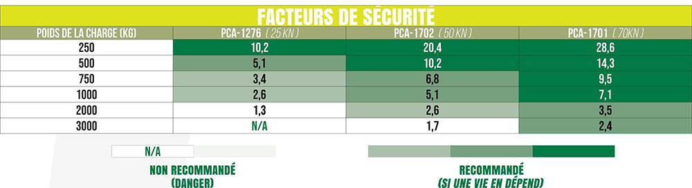 Reportez-vous au tableau pour connaître le facteur de sécurité obtenu avec chacun des mousquetons en fonction de la charge à déplacer.